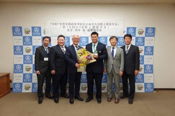 令和7年7月に広島県で行われました全国高等学校総合体育大会(インターハイ)で砲丸投3位、令和7年10月に三重県で行われました第19回U18陸上競技大会で砲丸投準優勝の結果報告をしてきました。
