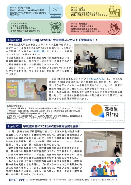 【STEAMコース】STEAM NEWS1月号!! STEAMコースの活動をお伝えする「STEAM NEWS」最新号を公開しました。 「世界に一つだけの修学旅行 in 福井 […]続きを読む STEAMコースの活動をお伝えする「STEAM NEWS」最新号を公開しました。 「世界に一つだけの修学旅行 in 福井・京都 」「ビジネスコンテストで快挙! 」「学校説明会での生徒発表」 の3本立てとなっています!ぜひ紙面でご覧ください。 2026年01月07日 コース