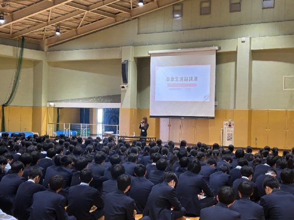 2学期の期末考査が終了しました。考査が終わったばかりの晴れやかな、それでいて少し落ち着かない雰囲気の中、本校では現役大学生の卒業生を招き、1・2年生に向けて進路講演会を開催しました。