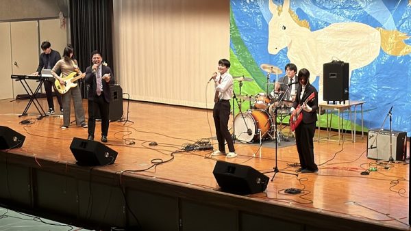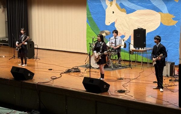 その後、演劇部が学校行事の思い出を盛り込んだコントを披露したほか、有志による歌唱、チアダンス部、新体操部、軽音楽部がそれぞれの発表を行いました。教職員による「先生バンド」の演奏では、会場が大きな盛り上がりを見せました。