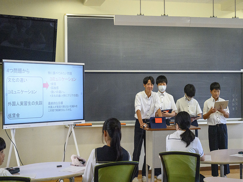 今回は、中学3年生が中間報告を実施しました。中学3年生は「労働」をテーマに探究活動をを実施しています。現在日本が抱えている労働問題についての改善策・解決策を検討し、それを企画していく形で実施しています。
