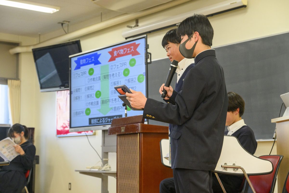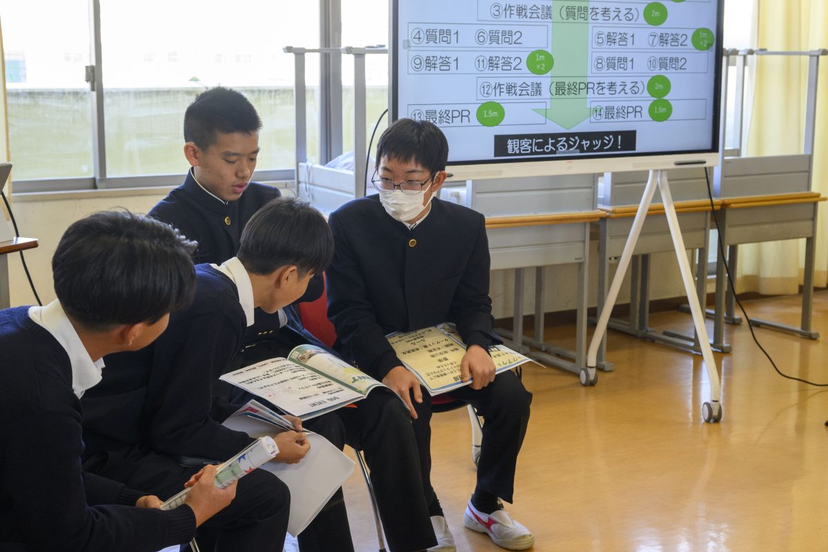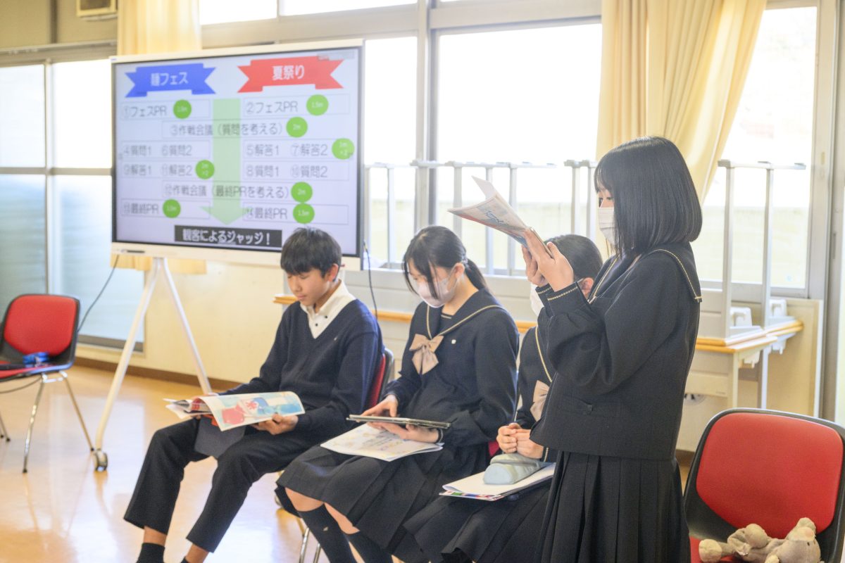 2年生は地域活性化のフェスを企画し、魅力的なフェスを実施するためにディベート大会が実施されました。各班ともに資料を多数用意し、PRを一生懸命実施していました。白熱したディベートバトルに観客も胸を踊らさせていました。