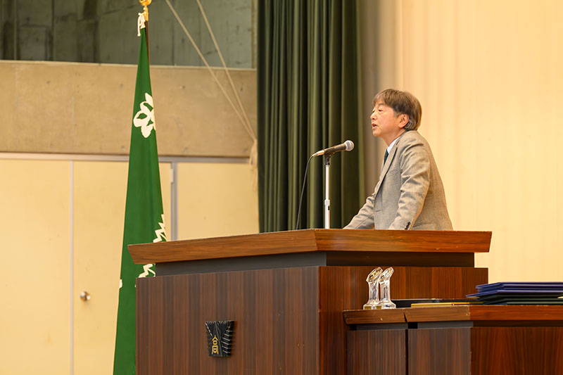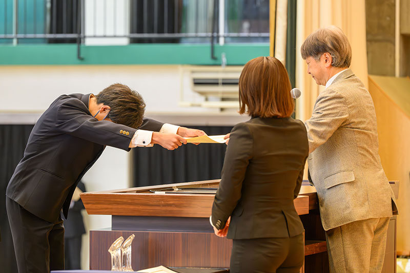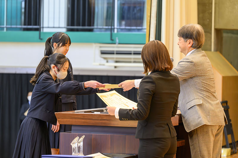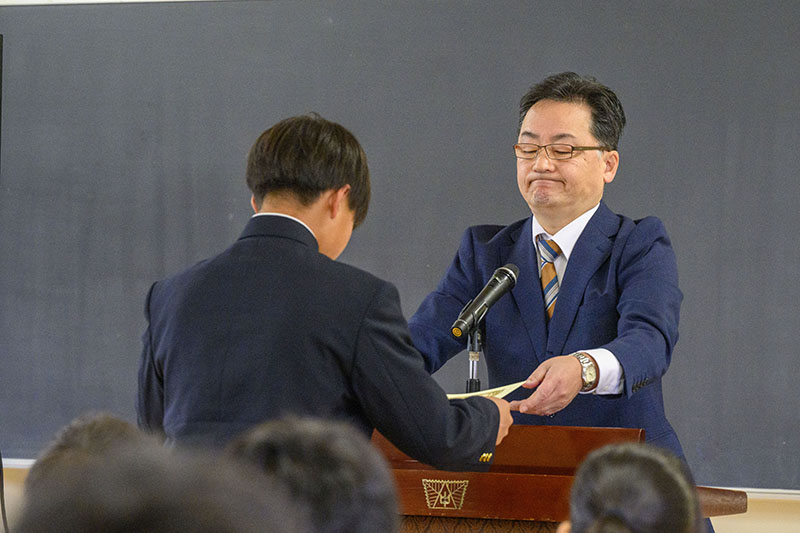 年間成績優秀賞・皆勤賞の生徒が表彰され、代表者が壇上にて賞状が授与されました。