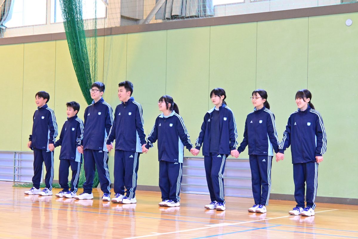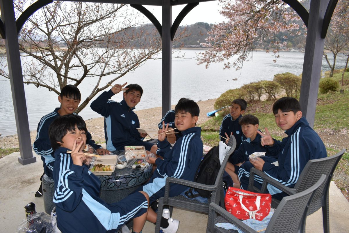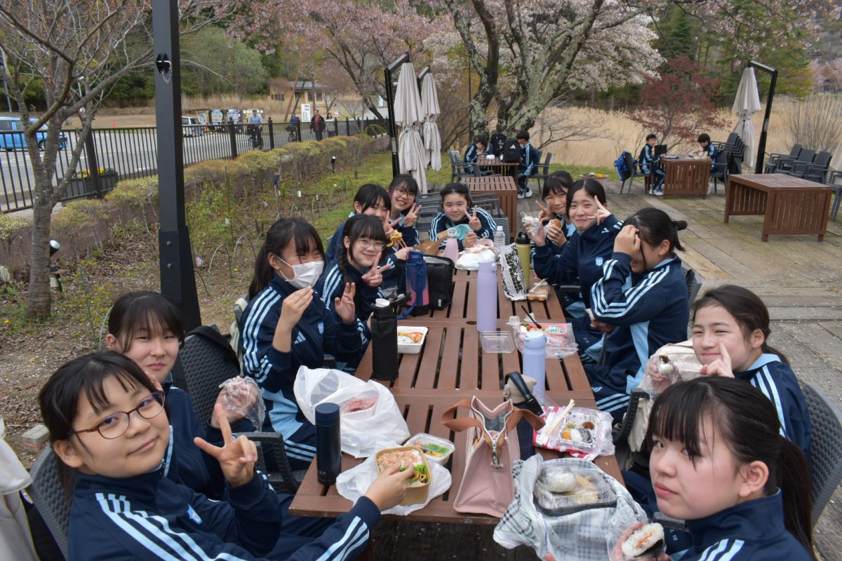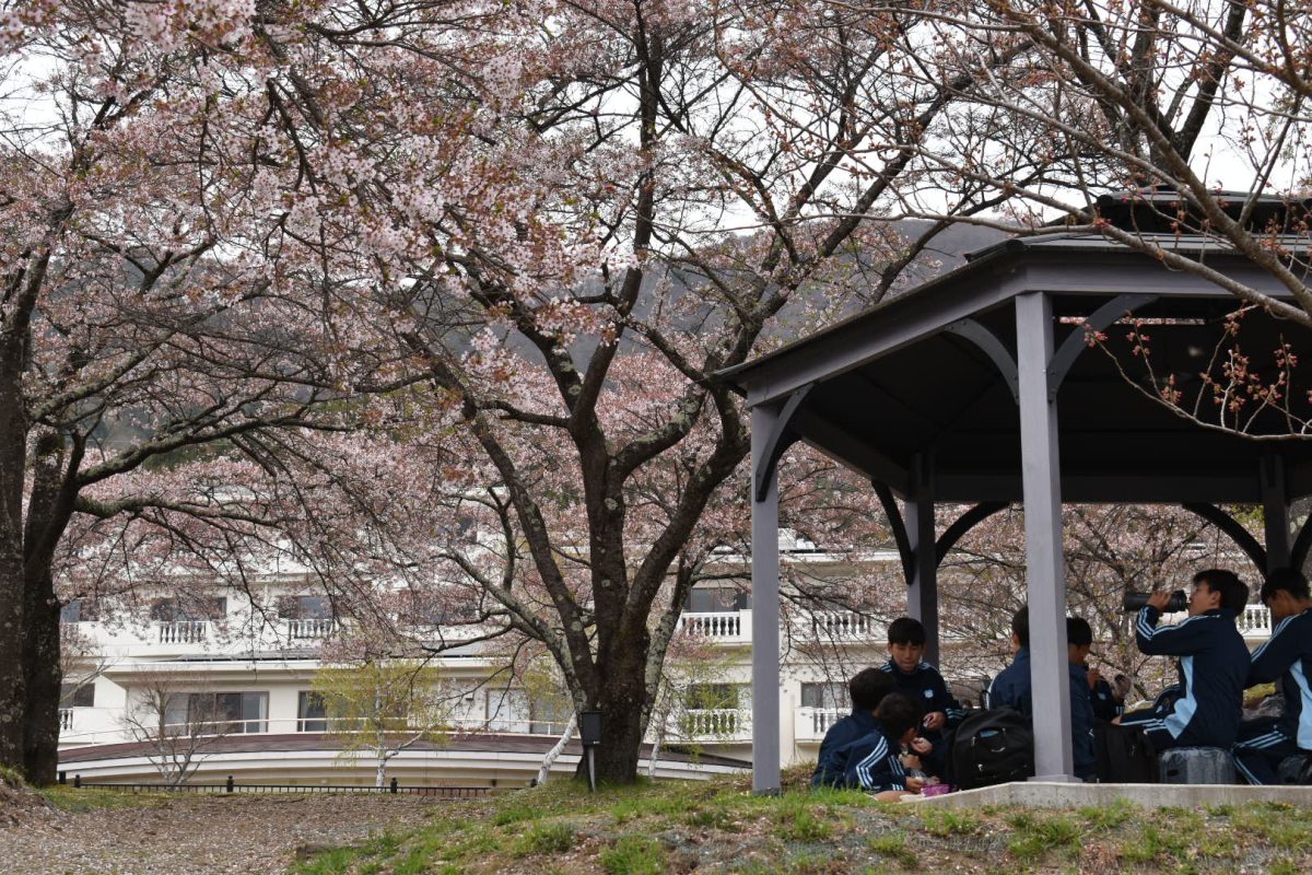 散り際の桜と湖をバックに、学年で初めての集合写真を撮影。
